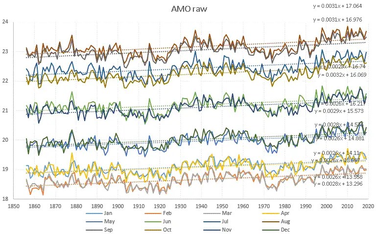 The new research on AMO by Professor Michael Mann appears to be meant to be somewhat provocative, which is OK as it spurred some discussion on Twitter. His peer-reviewed article is called “Absence of internal multidecadal and interdecadal oscillations in climate model simulations” and its takeaway is right in the title. Essentially, Mann et al are asking whether the ~60 year oscillation (and perhaps faster cycles) in the AMO behave as an internal property of the Atlantic ocean or whether the cycles are externally forced. Fig A1 in the Appendix provides some background on the AMO time-series data.