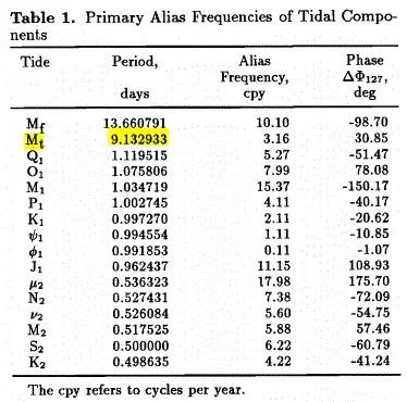 The two primary forcings acting mutually are also observed in tidal tables, in what is known as the long-period 9-day tide labelled “Mt” . From Fig 4 below the period of this tide is precisely 9.132933 days and so when applied to an annual impulse we get 365.242/ 9.132933 = 39.99175. This will reach a constructive interference against an annual impulse every 1/(40-39.9917)=121.3 years.