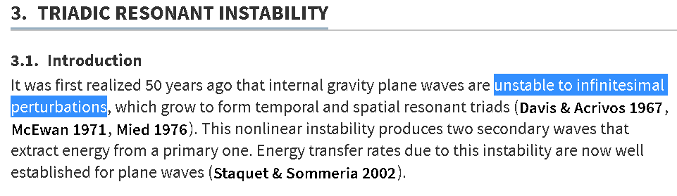 Here is a link to a recent paper from Davis et al on arXiv that covers their EGU presentation in greater depth : Succession of resonances to achieve internal wave turbulence. This is required reading to remove some of the inscrutability, yet still something seems over-cooked. It’s entirely possible that a natural resonance is interacting with the forcing wave — the fact that the LTE solution requires a single natural response frequency and yet all the satellite side-band pairs (counting 3) clearly align in Fig 7 may not be a coincidence.