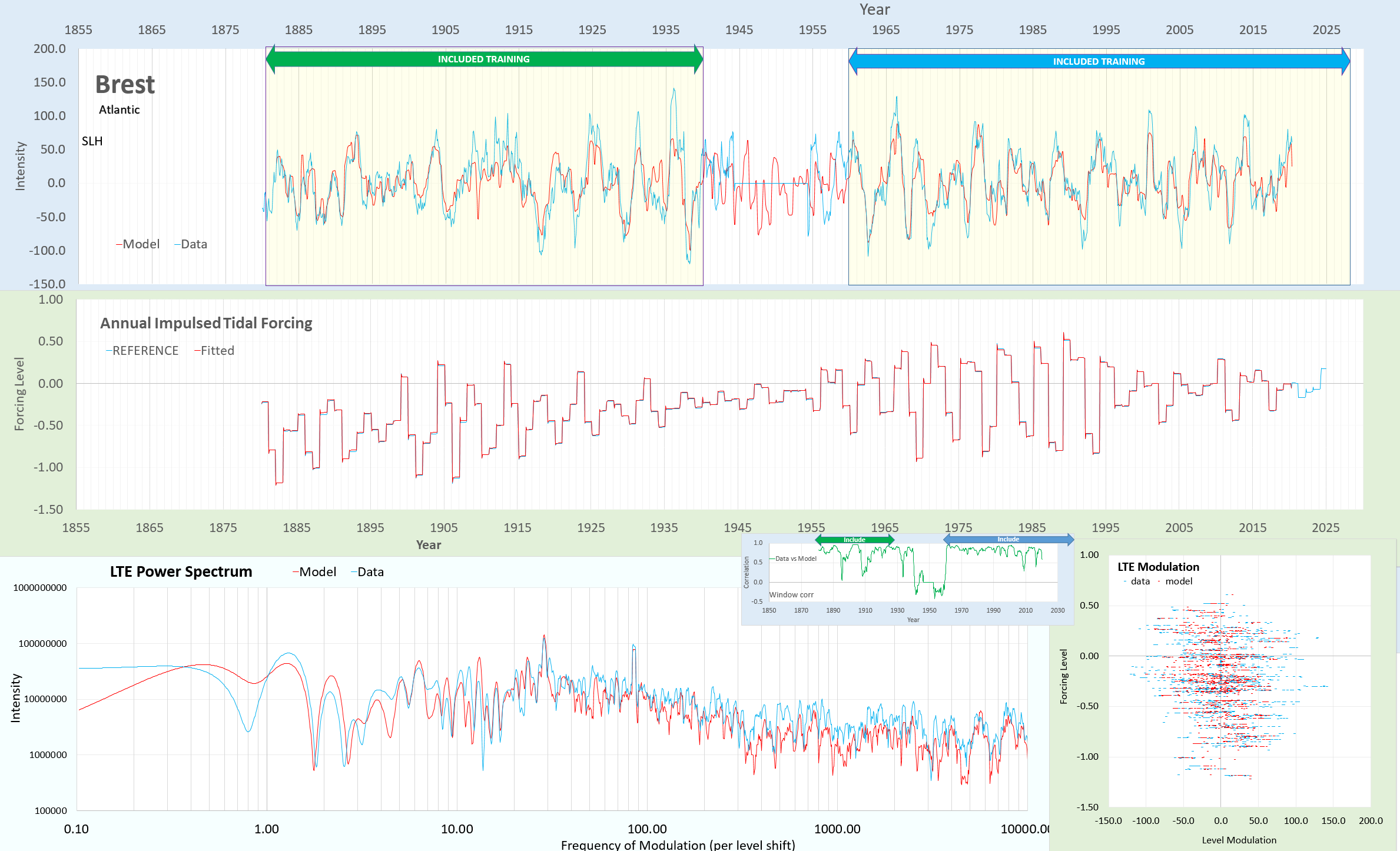 Graph showing sea level height (SLH) data and modeled values for Brest, Atlantic over time, with annual tidal forcing and LTE power spectrum analysis.
