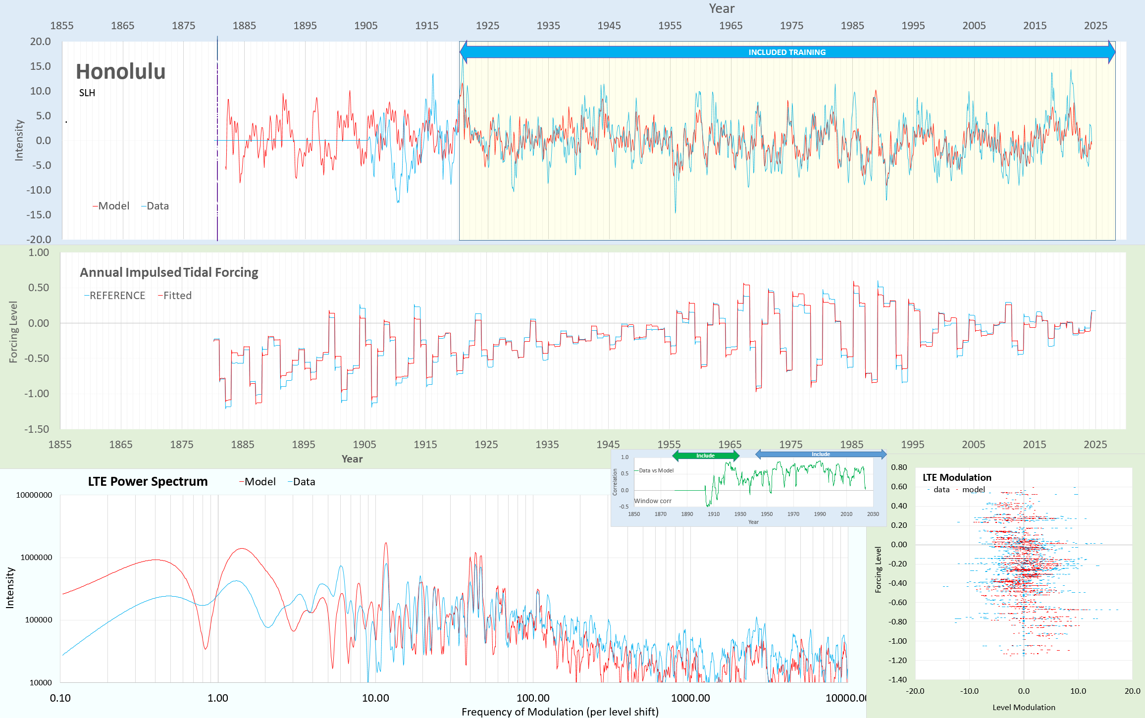 Line graph showing sea level height (SLH) measurements for Honolulu over the years, with model and data comparisons, including panels for annual impulsed tidal forcing and LTE power spectrum.