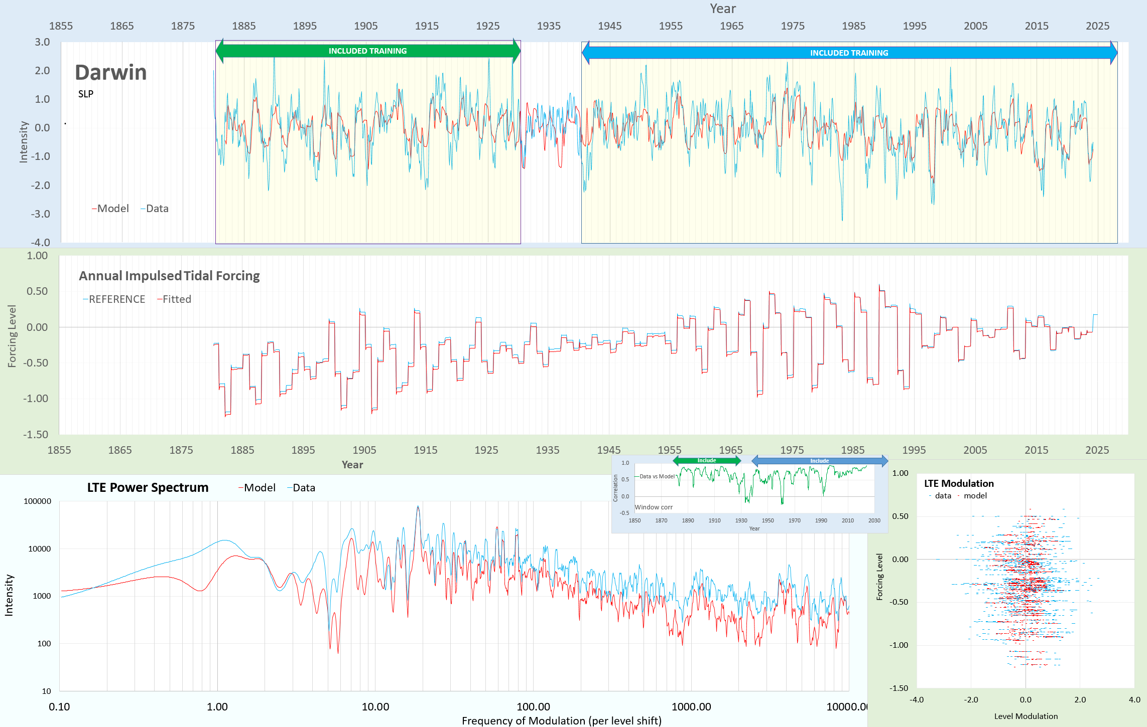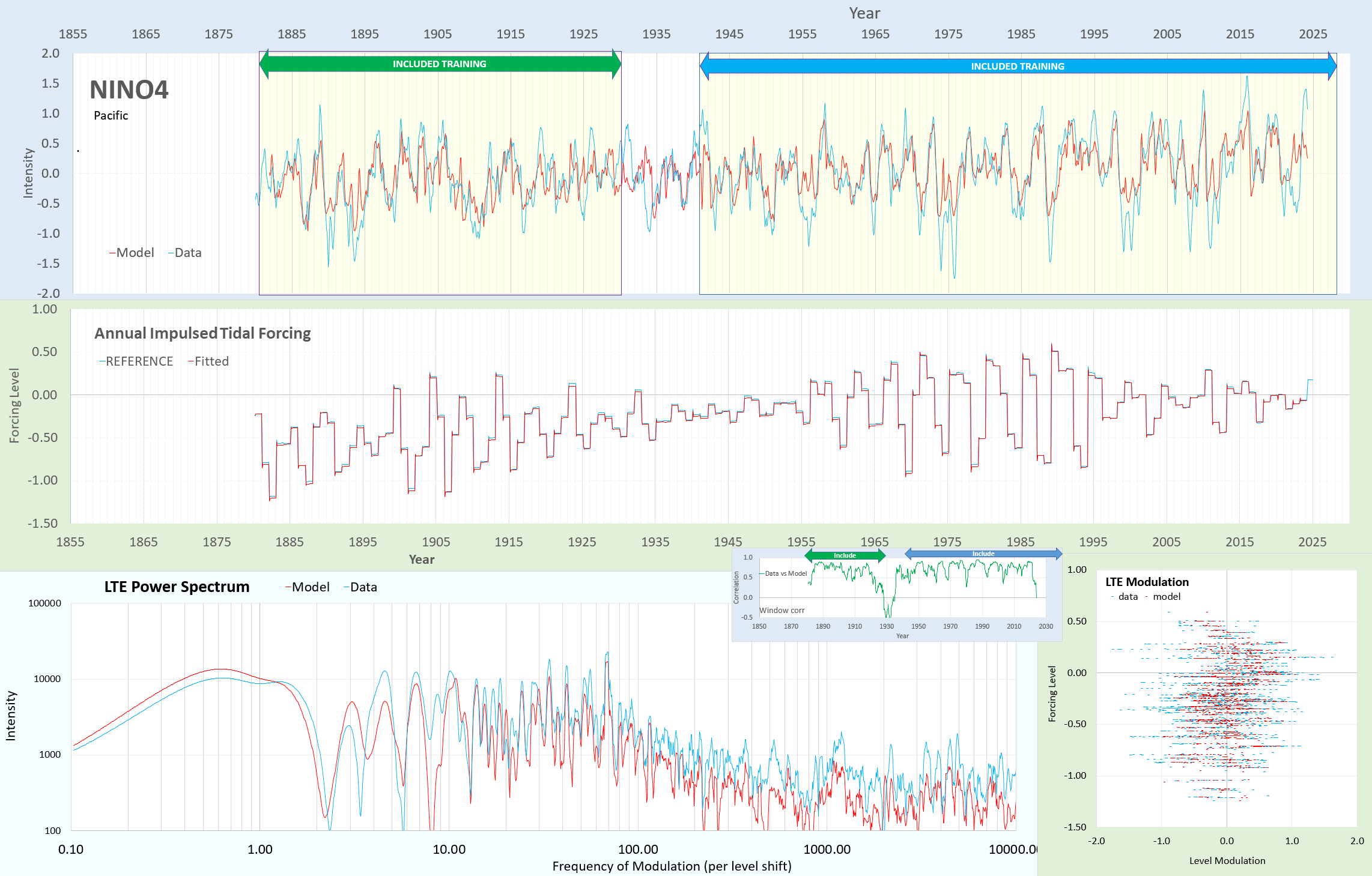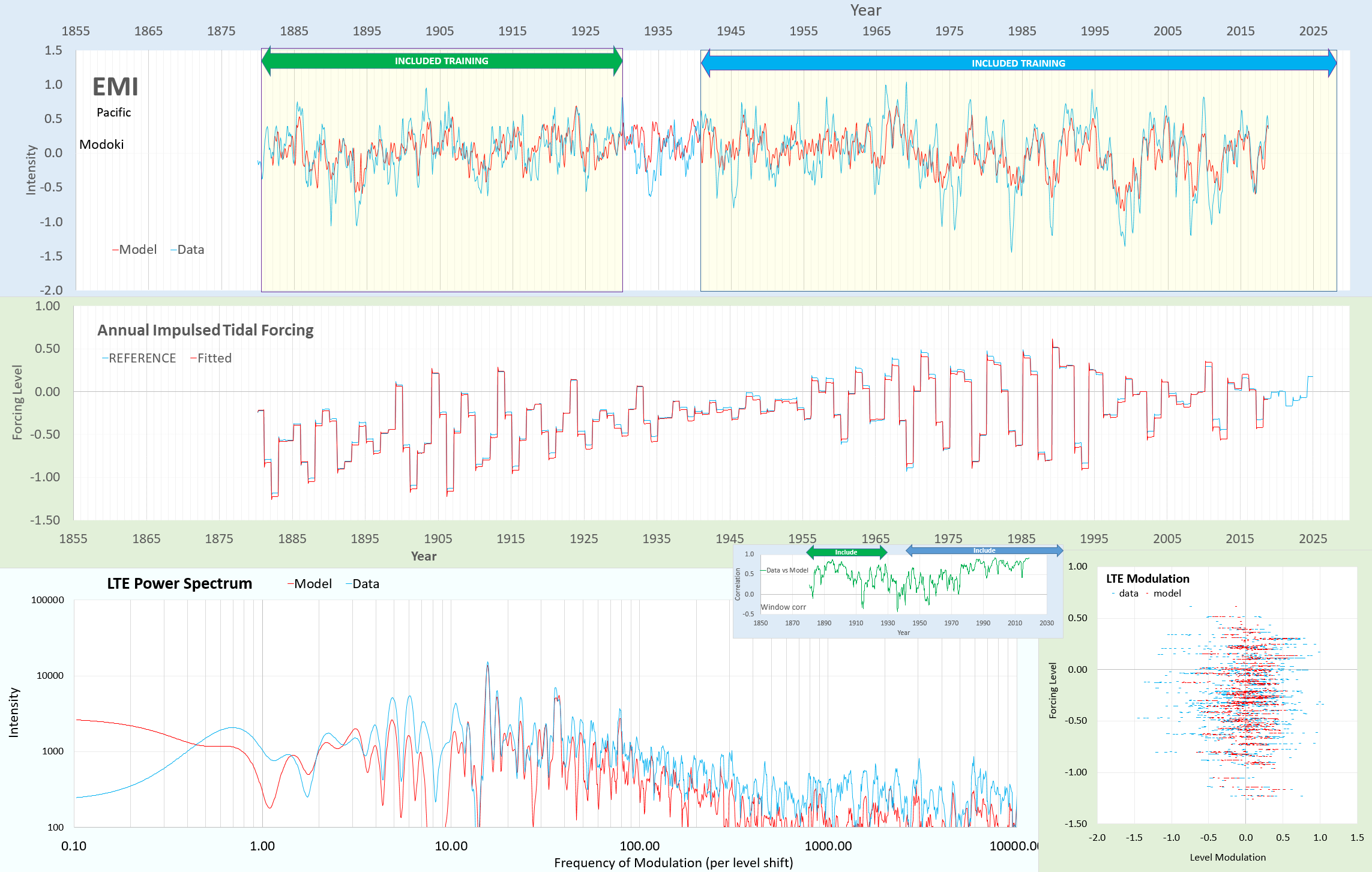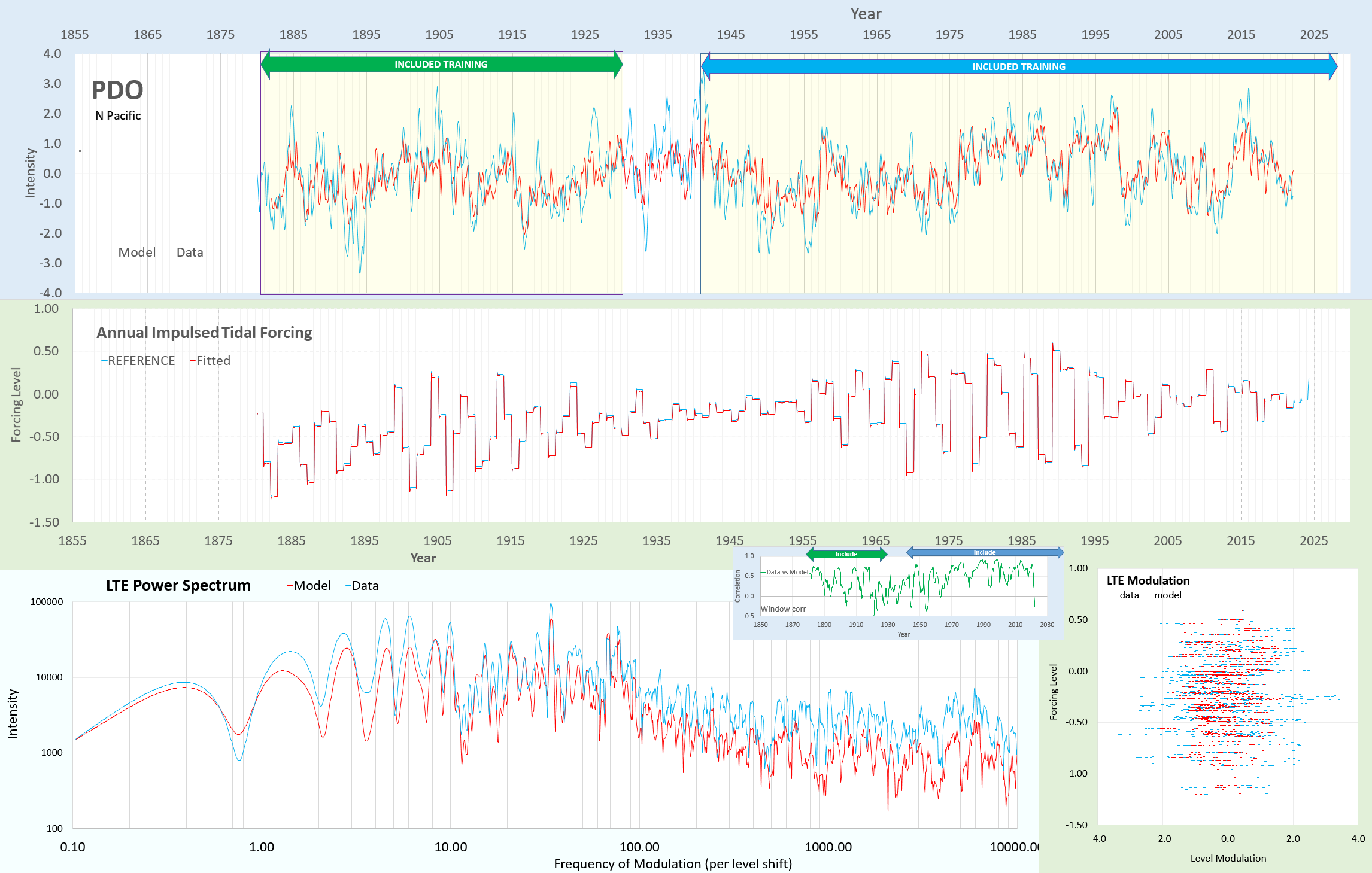 Graph displaying the Pacific Decadal Oscillation (PDO) alongside annual impulsed tidal forcing and LTE power spectrum data from 1855 to 2025, with model and data comparisons.