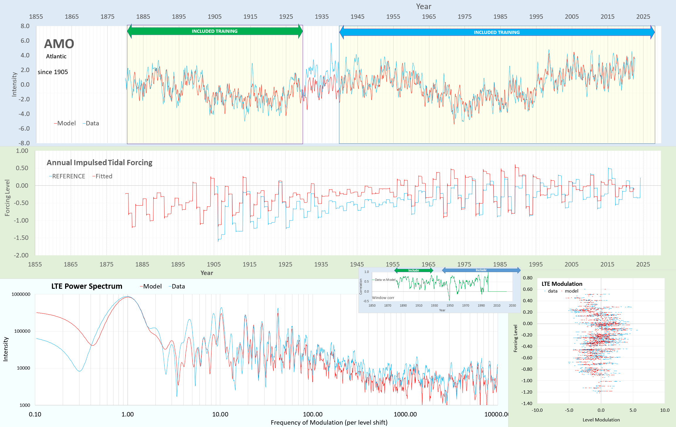 Graph showing the Atlantic Multidecadal Oscillation (AMO) intensity since 1905, including model and data comparisons, along with annual impulsed tidal forcing and LTE power spectrum.