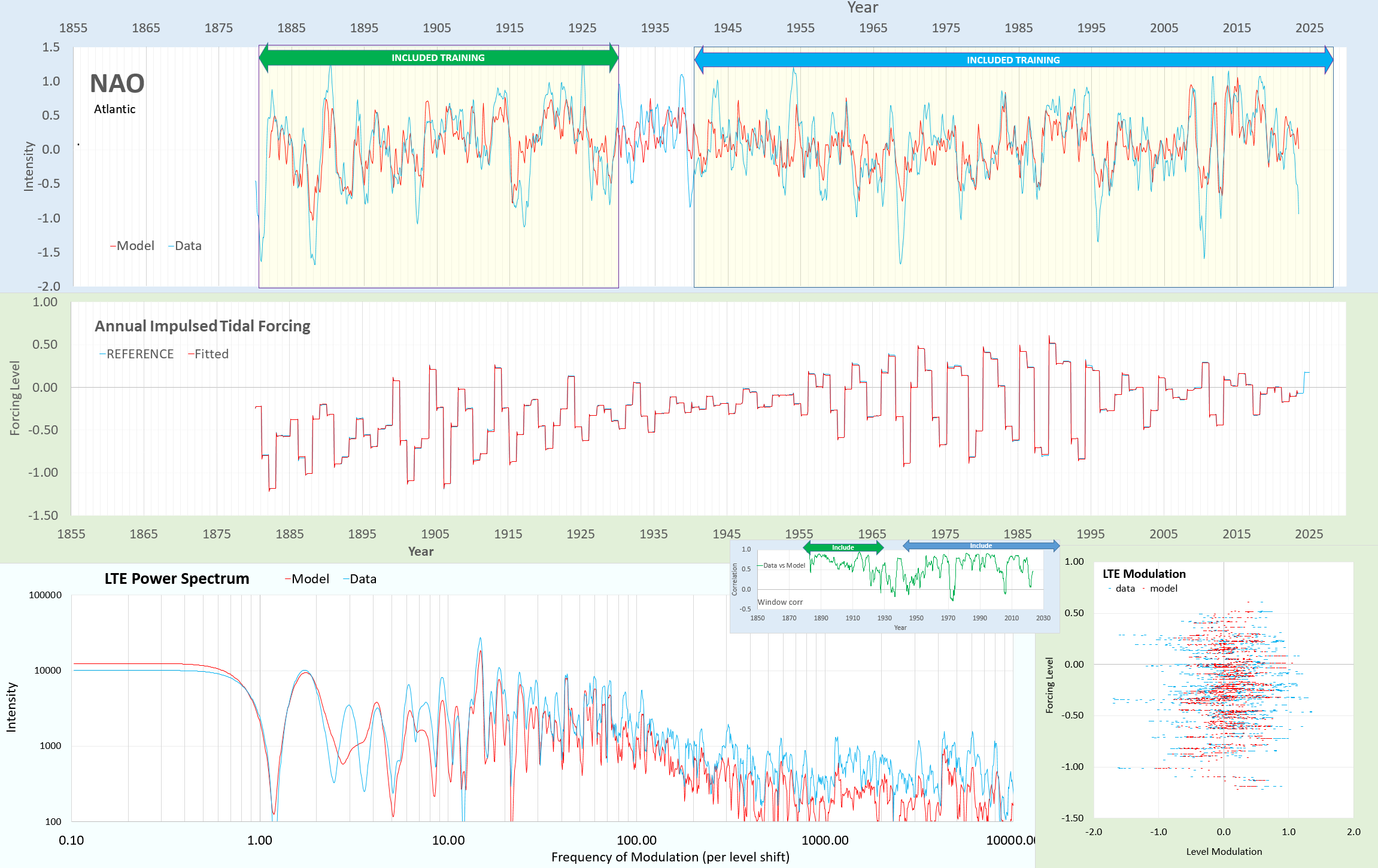 Graphical representation of the North Atlantic Oscillation (NAO) showing intensity over the years with model and data comparisons. Includes annual impulsed tidal forcing values and LTE power spectrum analysis.