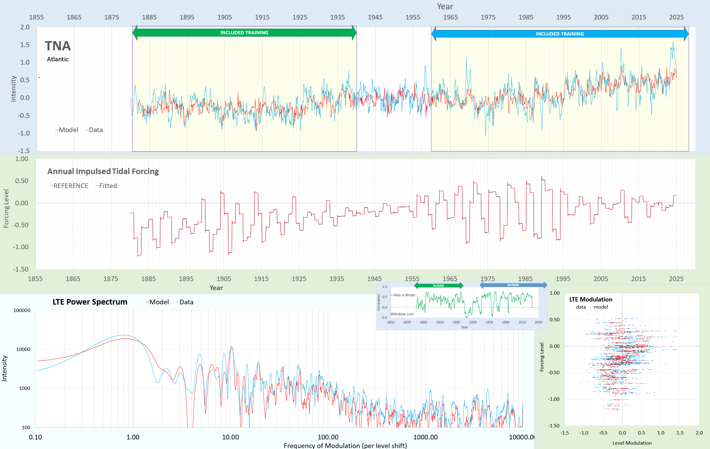 Graph depicting the Tropical South Atlantic (TSA) index with model and data comparisons, annual impulsed tidal forcing, and LTE power spectrum. Includes visible trends from 1855 to 2025.