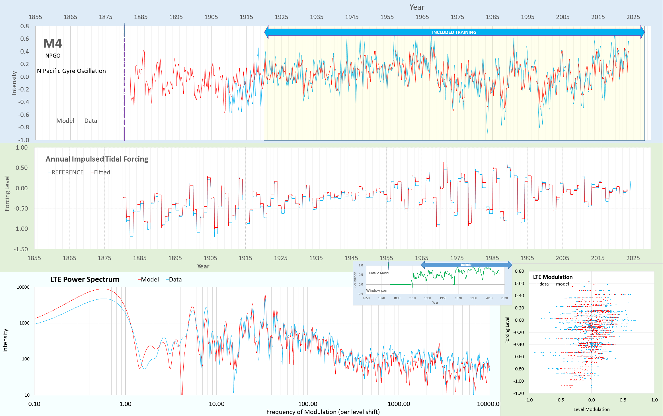 A very interesting but lesser known index, the North Pacific Gyre Oscillation (NPGO) aka M4. Crazy the amount of detail that the LTE response modulation picks up. Slight variation in the tidal forcing