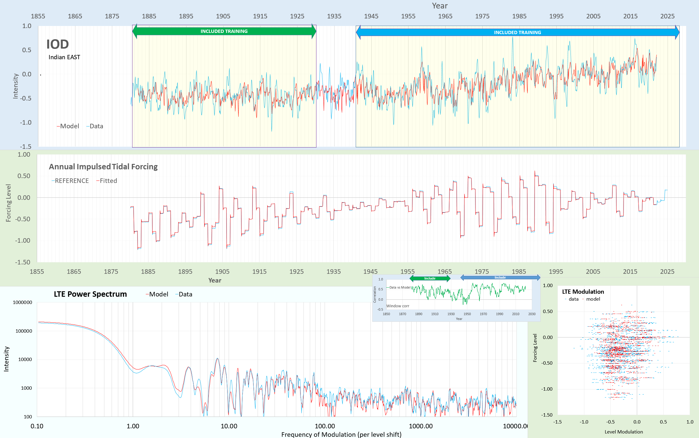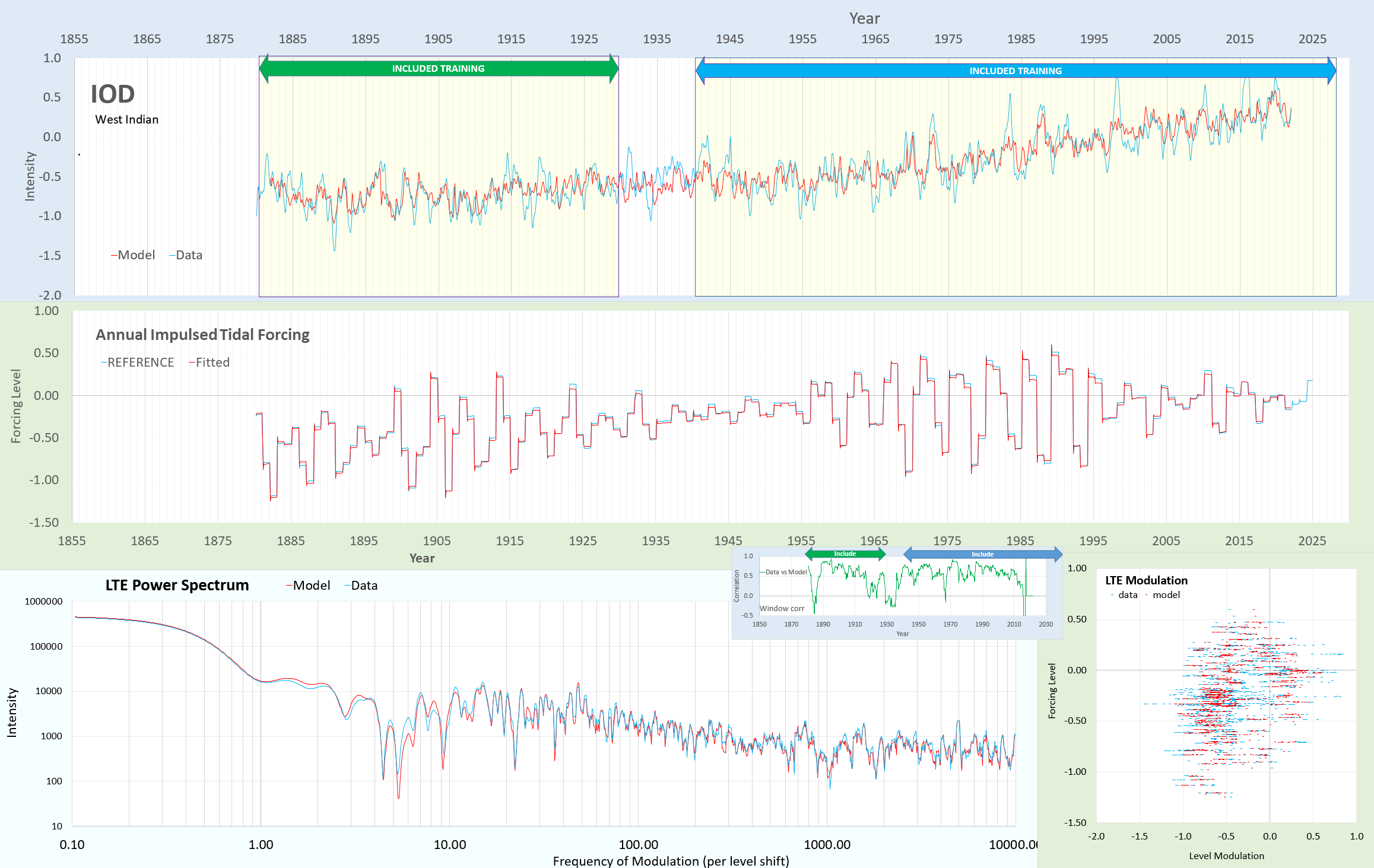 Graph depicting the Indian Ocean Dipole (IOD) intensity over time, comparing model data with fitted reference data. Includes training periods highlighted, along with annual impulsed tidal forcing data and LTE power spectrum analysis.